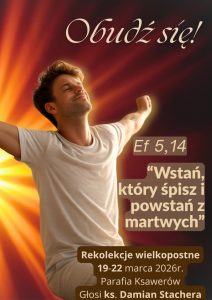 Rekolekcje wielkopostne z udziałem młodzieży i dorosłych „Obudź się!” 19–22 marca 2026 r. Animuje: ks. Damian Stachera 19 marca (czwartek) godz. 18:00 – Msza św. z udziałem dorosłych godz. 19:15 – Konferencja dla młodzieży, studentów i długo pracujących 20 marca (piątek) godz. 7:00 – Msza Święta z udziałem dorosłych Spowiedź od godz. 9:30 godz. …
