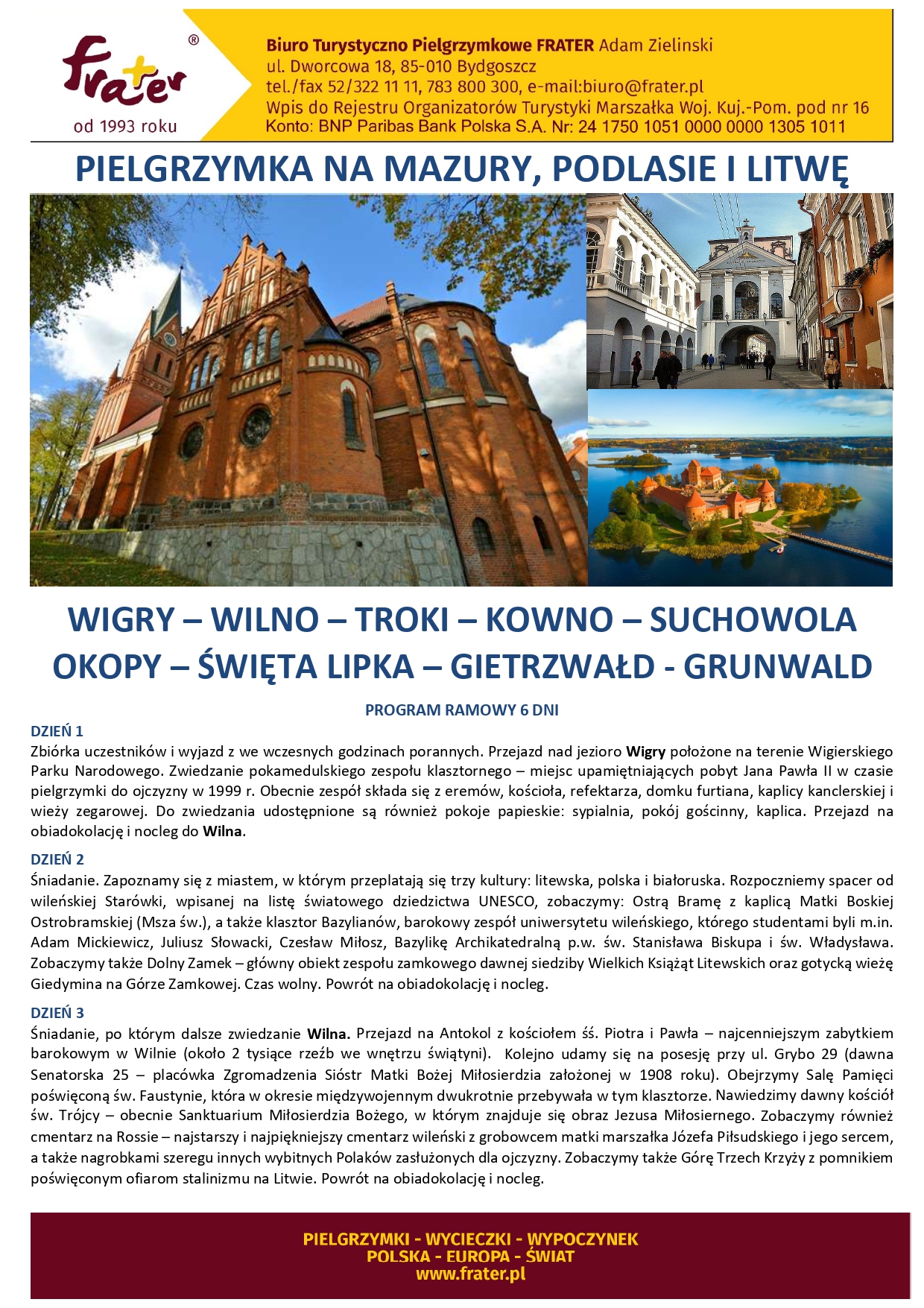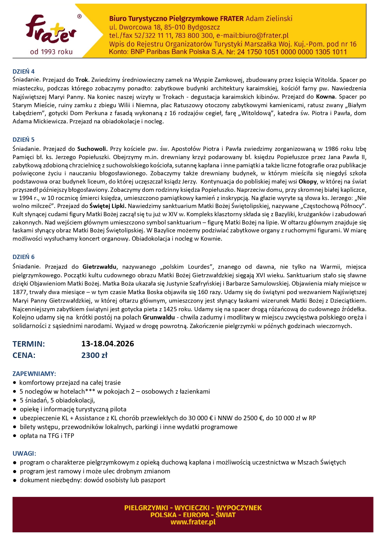 Pielgrzymka na Litwę, Podlasie i Mazury – 18-23 kwietnia 2026 r.
